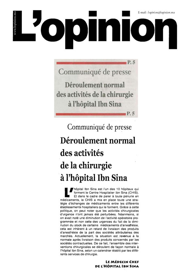 L'opinion : Communiqué de presse "Déroulement normal des activités de la chirurgie à l'hôpital Ibn Sina"